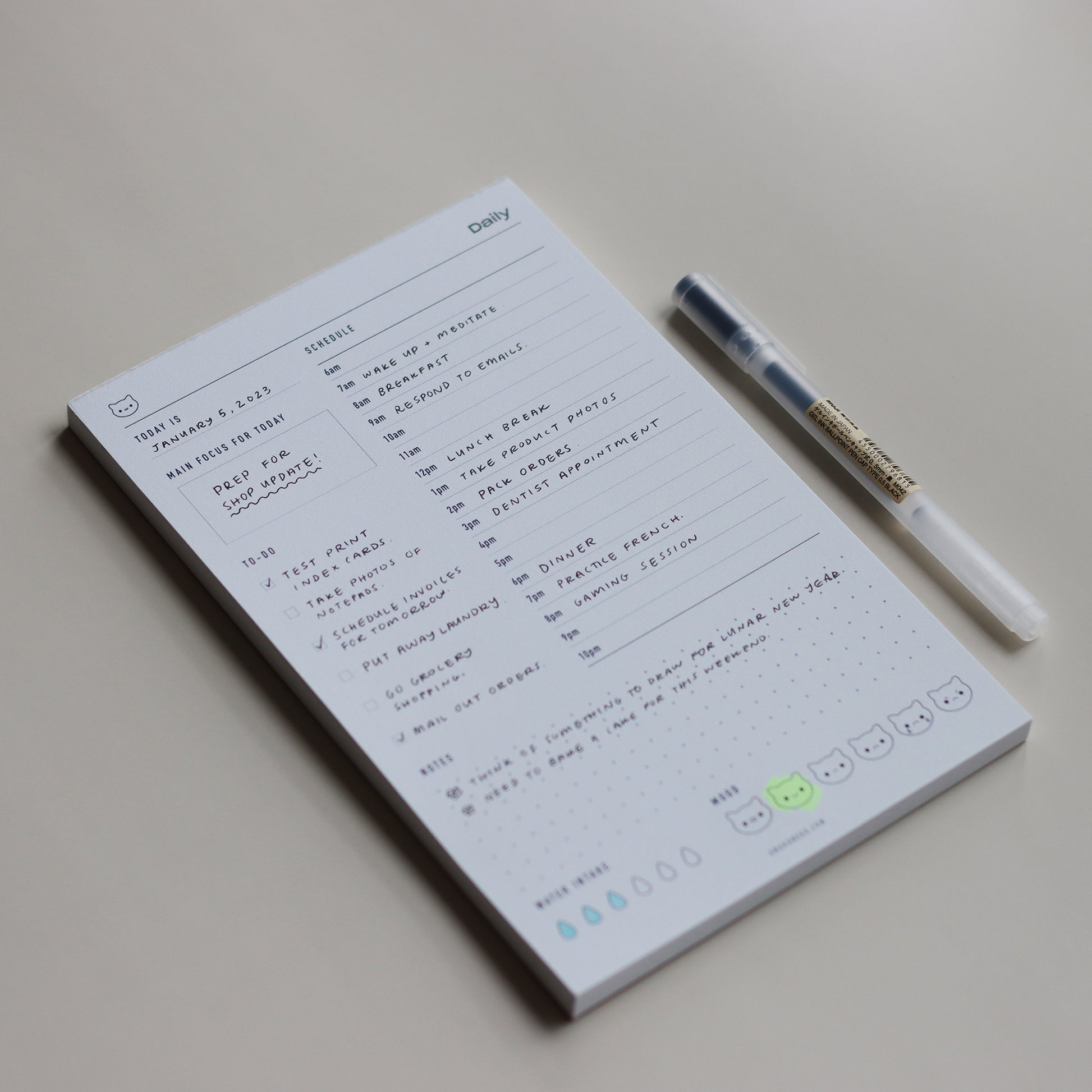 Plan and keep track of your day + mood + water intake, with this minimal but cute daily notepad!